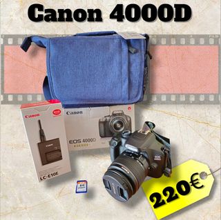 Camara réflex canon 4000D,se encuentra en perfecto estado, 3000 disparos,una cámara económica,con todo lo que necesitas para tener tu primera cámara reflex,es una cámara básica,fácil de utilizar,con buenos resultados,tiene 18mpx,graba videos en fullhd,varias opciones de modo de fotografía,flash incorporado,pantalla de 3 pulgadas,conexión wifi,9 puntos de enfoque,buen procesador DIGIC 4+,se entrega con objetivo 18-55, bateria,bolso,cargador y tarjeta, se puede enviar dentro de España por correo certificado por 15 euros más,cualquier duda por aquí o por WhatsApp al 727797700,su precio 220 euros, aprovecha esta oportunidad