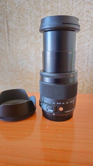 Objetivo sigma 18-200,se encuentra en perfecto estado,para montura Canon.Este objetivo todoterreno incorpora la función OS (Estabilizador Óptico).Es ideal para condiciones de poca luz como en interiores y al atardecer,para viajes es el compañero ideal.El cristal SLD (Especial baja dispersión) y asférico proporcionan una excelente corrección para todo tipo de aberraciones.tiene una distancia mínima de enfoque de 45cm en toda el zoom y una ampliación máxima de 1:3.9.El sistema de enfoque interno proporciona un alto rendimiento y comodidad,con un excelente rendimiento óptico,se entrega con sus tapas y parasol,se puede enviar x 15€