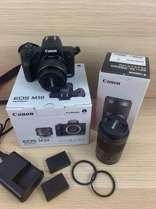 Se vende cámara Canon EOS M50 con dos objetivos. - Cuerpo de cámara Canon EOS M50, 24.1MP - Objetivo Canon EF-M 15-45mm f/3.5-6.3 IS STM. - Objetivo Canon EF-M 55-200mm f/4.5-6.3 IS STM. - Cargador de batería. - Dos baterías. Muy versátil para cualquier tipo de fotografía, perfecta para llevarla a todas partes por su peso y tamaño. Gracias a su grabación 4K, entrada de micrófono y pantalla abatible que permite verte mientras te grabas, es ideal también para vlogging. Está prácticamente nueva, sin uso.