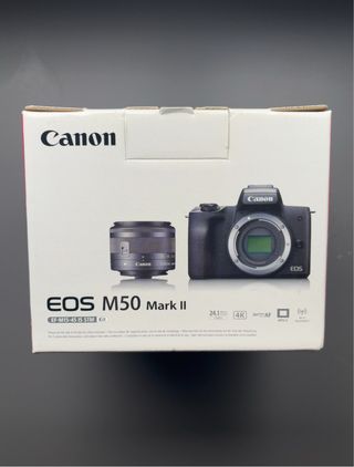 Cámara sin espejo Canon EOS M50 Mark II en kit con objetivo EF-M15-45mm IS STM. - Sensor APS-C. - Grabación de vídeo 4K. - Enfoque automático Dual Pixel. - Conectividad Wi-Fi y Bluetooth. Casi no la usé, 1 vez o 2 está prácticamente nueva.