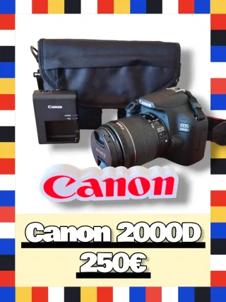 Camara réflex canon 2000D,se encuentra en perfecto estado,prácticamente a estrenar,5500 click,una cámara económica,con todo lo que necesitas para tener tu primera cámara reflex,es una cámara básica,fácil de utilizar,con buenos resultados,tiene 24mpx,graba videos en fullhd,ISO 100-6400 hasta 12800,varias opciones de modo de fotografía,flash incorporado,pantalla de 3 pulgadas,conexión wifi,9 puntos de enfoque,se entrega con bolso, bateria,cargador y objetivo 18-55 estabilizado,se puede enviar dentro de España por correo certificado por 15€ más,cualquier duda por aquí o por WhatsApp al 727797700,su precio 250€,añade tarjeta 64gb por 8€