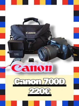 Cámara reflex canon 700D,se encuentra en perfecto estado,una gran cámara para fotografos aficionados y profesionales,cuenta con 18mpx,grabacion de video en fullhd,pantalla de 3 pulgadas abatible y táctil,procesador DIGIC 5,para un rendimiento fiable,ISO 100-25600,flash incorporado,rapida e intuitiva,se entrega con objetivo 18-55 vr,bolso,tarjeta,bateria y cargador,se puede enviar dentro de España por correo certificado por 15 euros más,cualquier duda por aquí o por WhatsApp al 727797700,su precio 220 euros,añade tripode nuevo 45 euros