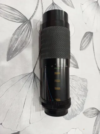 Objetivo zoom Canon FD de 70-300mm. - Rango de zoom: 70mm a 300mm. - Apertura variable: f/4-5.6. - Escala de distancia focal y apertura visible.