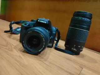 Ideal para aprender fotografía. Equipo muy cuidado. Incluye: Cuerpo Canon EOS 1000D. Objetivo Canon 18-55mm (versátil). Teleobjetivo Canon 75-300mm (fotos a distancia). Trípode Hama Star 63 con bolsa. Kit limpieza Hama (pera, líquido y gamuzas). Cargador marca Patona y correa original. IMPORTANTE: Las baterías no mantienen la carga por el tiempo. El equipo funciona perfecto, pero requiere batería nueva (Modelo LP-E5, ~15€ en Amazon). Precio ajustado por este motivo.
