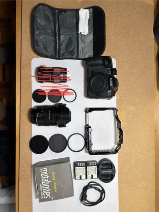Kit Panasonic GH5 II con accesorios. Cámara usada principalmente para grabar. La vendo por cambiar a full frame. - Cuerpo de cámara Panasonic GH5 II. Con caja original. (500€) **IMPORTANTE** El puerto HDMI no funciona, de ahí su precio reducido. - Jaula Smallrig para cámara. (50€) - Objetivo Lumix Leica 12-60mm F 2.8 - 4. (425€) - VENDIDO Objetivo Olympus 60mm F 2.8 MACRO. Con caja original - Adaptador Metabones Speed Booster x0.71 de MFT a EF. Con caja original (250€) - 2 Baterías Newmoma y cargador - Filtros marca HOYA con estuche: UV, ND y polarizador para ambos objetivos Comprando el kit entero: 1150€