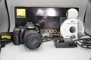 Cámara réflex digital Nikon D3000 en color negro. Ideal para iniciarse en la fotografía. - Incluye objetivo. 18-55 - Correa para colgar y dos bolsas de transporte. - Bolsa para la lluvia y kit de limpieza - Cargador original y cable para pasar las fotos al ordenador. - Tarjeta SD. - Tapa de objetivo.