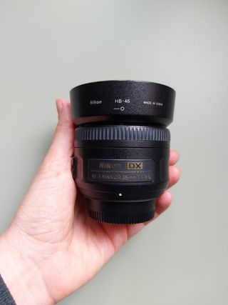 Objetivo Nikon AF-S DX NIKKOR 35mm f/1.8G. El motivo de la venta es que no lo uso hace tiempo porque ya no llevo Nikon. Incluye parasol y funda - Montura F. - Apertura máxima f/1.8. - Diseño compacto y ligero.