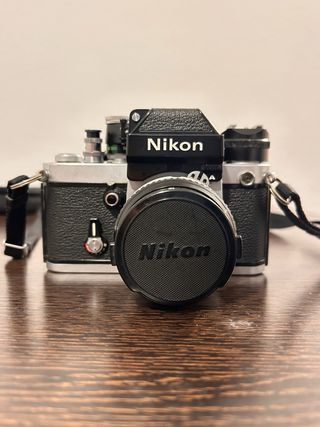 Cámara réflex analógica Nikon F2 con objetivo Nikkor 50mm f/2. Fotómetro funcionando, lente en perfecto estado con sus ruedas muy suaves. Perfectamente funcional, todos los mecanismos perfectos. Revisada por miyagi studio en Madrid hace unos meses. No muestro el interior porque la sigo usando y tengo carrete dentro. Puedo hacer videos de prueba bajo pedido. - Cuerpo de cámara Nikon F2 - Objetivo Nikkor 50mm 1:2 - Zapata para flash - Correa cuello - Filtro UV