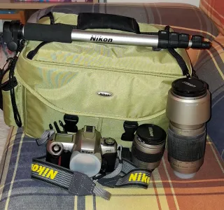 Conjunto de fotografía analógica Nikon F65 con accesorios. - Cámara analógica Nikon F65. - Objetivo Nikon 70-300mm f/4-5.6 ED. - Objetivo Nikon 28-80mm f/3.3-5.6. - Bolsa de transporte Nikon. - Correa para cámara Nikon. - Parasol para objetivo.