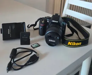 Se vende cámara réflex Nikon en perfecto estado, junto con todos sus accesorios. - Cámara réflex Nikon (cuerpo+objetivo) - Batería recargable - Cargador de batería - Tarjeta de memoria SD 4gb. - Cable USB - Bolsa cámara - Libro de fotos y manual - Sin caja