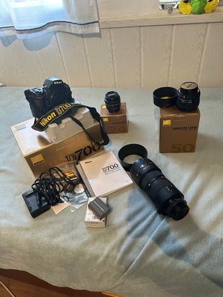 Se vende cámara réflex digital Nikon D700 con su kit completo. 100.517 disparos. AF Zoom-NIKKOR 80-200mm f/2.8D ED, tiene el típico fallo de estos objetivos, que es el botón de cambio a Manual , pero funciona perfectamente. Objetivo Nikon AF 24/2.8 D Lente compacto f/2.8 gran angular con distancia focal fija y control de apertura manual. Objetivo AF-S NIKKOR 50mm f/1.8G Resolución: 12Mp Tecnología: Full frame CMOS ISO: 200-6400 Peso: 1074g Dimensiones: 147 x 123 x 77 mm Visor: Optical (pentaprism) Tipo pantalla: 3" Fixed - Batería recargable. - Cargador de batería. - Manual de usuario. PRECIO NEGOCIABLE SOLO VENTA EN PERSONA