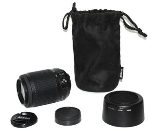 Objetivo Nikon Nikkor DX 55-200mm f/4.0-5.6 G ED VR. - Incluye parasol y tapas. - Bolsa de transporte de tela.