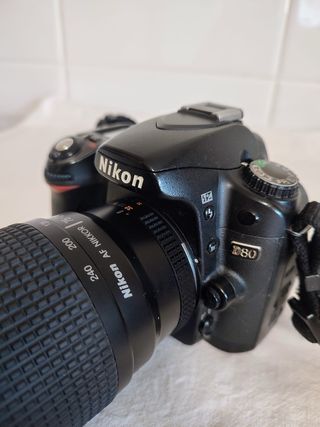 Vendo cámara réflex Nikon D80 en buen estado. Incluye un objetivo AF Nikkor 240-700mm. - Cámara réflex digital. - Objetivo 240-700 mm. - En excelentes condiciones.