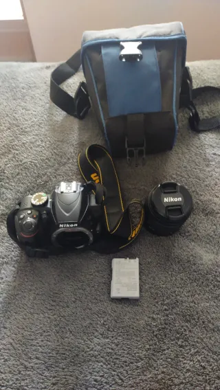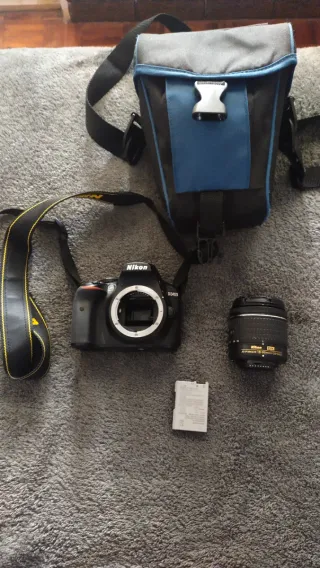 Se vende cámara Nikon con su bolso de transporte y accesorios. - Cámara réflex digital Nikon. - Bolso de cámara acolchado. - Batería. - Tapa de objetivo.
