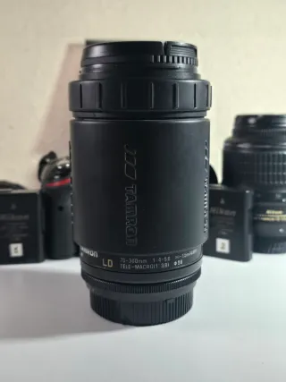 Se vende cámara réflex analógica Nikon F75 en excelente estado, casi como nueva. Incluye dos objetivos y varios accesorios para fotografía. - Cámara Nikon F75. - Objetivo Nikon 28-80 y télex 70-300 - Objetivo Cosina gran angular. - Dos bolsas de transporte para objetivos. - Correa para cámara.