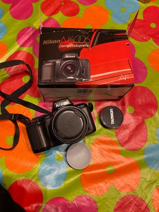 Vendo una cámara Nikon N6006. Es una cámara réflex de 35 mm, ideal para principiantes o aficionados a la fotografía. Incluye la cámara y un objetivo. - Cámara réflex de película de 35 mm. - Objetivo incluido.