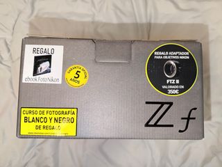 Cámara Nikon Zf con objetivo 40/2 SE, grip y batería adicional. - Objetivo Nikkor Z 40mm f/2 SE. - Empuñadura adicional. - Batería extra incluida. - Incluye adaptador FTZ II valorado en 350€. - Regalo: ebook FotoNikon. - Regalo: Curso de fotografía Blanco y Negro. Comprado en agosto 2025 con menos de 1000 disparos, la vendo por disponer se otros equipos. En perfecto estado ni un rasguño, desde el primer día con protección en la pantalla y vinilo decorativo en el el cuerpo y lente.