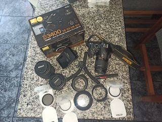 Cámara réflex digital Nikon D3400 en color negro. Con dos objetivos (los mostrados en las imágenes. Vendo por falta de uso, en perfectas condiciones. Incluyo la mochila. - Sensor DX. - Pantalla LCD. - Conectividad Wi-Fi y Bluetooth.