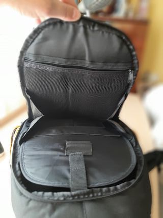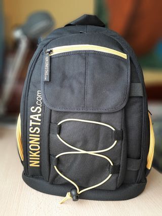 Mochila negra de la marca Nikonista, ideal para transportar tu equipo fotográfico. Sin uso. - Compartimentos acolchados para cámara y objetivos. - Cierre de cremallera. - Correas ajustables. - Diseño moderno con detalles amarillos.