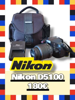 Cámara reflex nikon D5100,se encuentra en muy buen estado,24800 click,una cámara ideal para aficionados o para empezar estudiar fotografía profesional,cuenta con 16 mpx,graba videos en fullhd,pantalla de 3 pulgadas abatible,flash incorporado,varias opciones de fotografía,ISO 100-12.800(ampliable a 25600),11 puntos de enfoque,se entrega con objetivo 18-55 vr,bolso,bateria y cargador,se puede enviar dentro de España por correo certificado por 15 euros más,cualquier duda por aquí o por WhatsApp al 727797700,su precio 180 euros,añade tarjeta 64gb nueva por 8 euros más