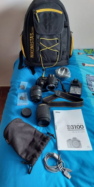 Se vende cámara Nikon D3100 El pack incluye: - Objetivo AF-S DX 18-55 mm Nikon. - Objetivo AF-S DX 55-200 mm Nikon. - Bateria y cargador. - Mochila marca Nikon para transporte de todos los componentes de la cámara. - Caja de Nikon. Es una cámara perfecta para aprender y se encuentra en perfecto estado.