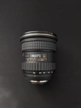 Objetivo Tokina AT-X PRO SD 12-24mm F4 (IF) DX para cámaras Nikon. - Rango focal de 12-24mm. - Apertura máxima de F4. Está en perfecto estado, pero le falta el parasol. Vendo por comprar otro. *Algo Negociable*
