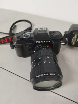 Cámara réflex analógica Pentax P30N en color negro. - Objetivo Pentax-A Zoom 1:3.5-4.5. - Correa de transporte incluida. !!!!EL flash se regala solo se vende la cámara y flash de regalo