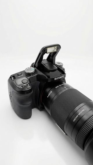 Cámara réflex digital Sony en color negro. - Cuerpo de cámara. - Objetivo con parasol. 70/300 y 55/85