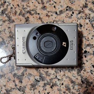 Canon IXUS formato APS (cámara analógica, NO digital). Modelo clásico de Canon (serie IXUS/ELPH/IXY), muy compacta, con zoom 24–48 mm y flash emergente. Estado y funcionamiento: Enciende correctamente (ver fotos con pantalla superior). Objetivo abre/cierra y flash sube/baja (ver fotos). Incluye pila CR2 nueva (la de la foto). Importante: usa carretes APS (Advantix). No lleva tarjeta SD ni pantalla digital. Entrega en mano en La Vall d’Uixó y/o envío por Wallapop.