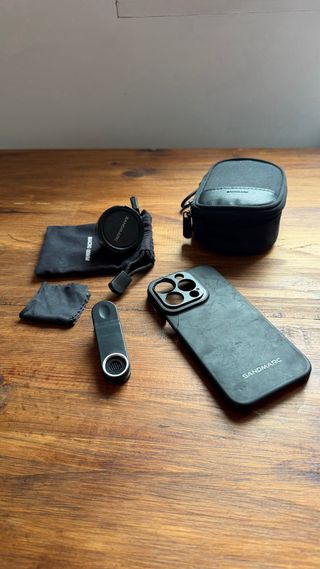 Lente macro de 100mm de la marca Sandmarc, diseñada para iPhone. - Compatible con iPhone. - Montura para lente. - Diseño compacto. Todo está en perfecto estado, lo único que esta deteriorada (pero se puede usar) es la funda y esta solo sirve para iphone 15 pro aunque el objetivo es para cualquier iphone ya que tiene la pinza.