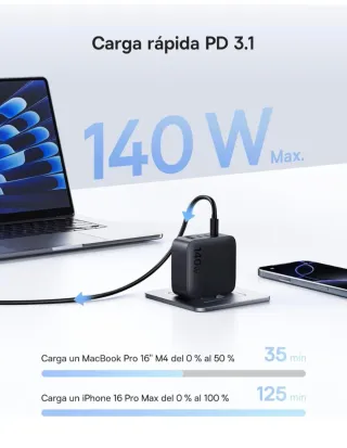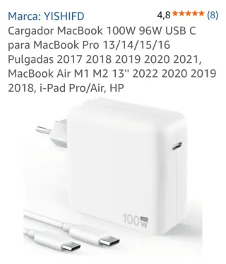 Cargador de alta potencia para tus dispositivos. - Potencia de 100W y 96W. - Conexión USB C. - Compatible con MacBook Pro, MacBook Air, iPad Pro/Air y HP.