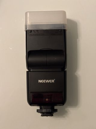 Flash Neewer NW400S en color negro, con difusor blanco. - Incluye funda protectora. - Pantalla LCD. - Botones de control: MODE, ZOOM, C.Fn, SET, SYNC, SLAVE, GRICH.
