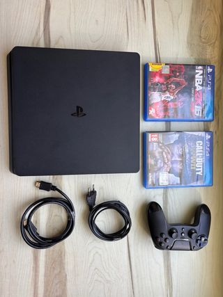 Consola PlayStation 4 Slim de 500 GB en color negro. - Incluye mando DualShock 4. - Cable de alimentación. - Cable HDMI. - Juego NBA 2K16. - Juego Call of Duty: WWII.