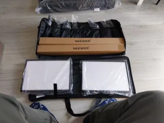 Kit de luces Neewer en su bolsa de transporte. - Bolsa de transporte de color negro. - Cierre con cremallera y asa. Son 100€ cada 1 .si 2 kit