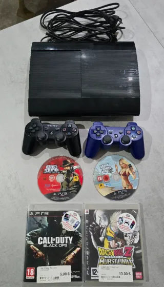 Se vende pack de PlayStation 3 Super Slim de 500 gb con todo lo necesario para empezar a jugar. Incluye la consola,cables, dos mandos y varios juegos. - Consola PlayStation 3 Super Slim. - Mando DualShock 3 negro original. - Mando Azul compatible nuevo a estrenar. - Juego Red Dead Redemption (Game of the Year Edition),solo disco. - Juego Grand Theft Auto V,solo disco. - Juego Call of Duty: Black Ops. - Juego Dragon Ball Z: Burst Limit. # ps3,ps4,ps5,nintendo switch 2,playstation 5.
