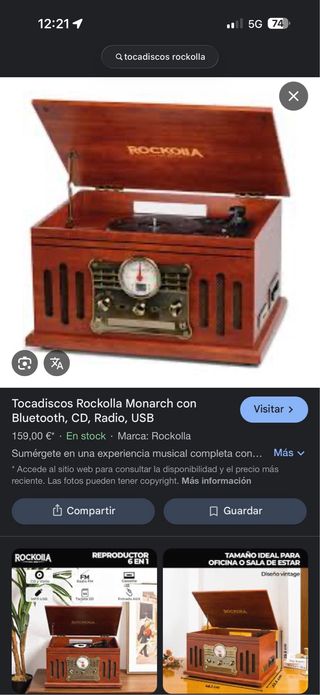 Este tocadiscos Rockolla Monarch tiene un diseño clásico y elegante. - Acabado en madera de color marrón. - Frontal con detalles metálicos y dial analógico. - Altavoces integrados a los lados.
