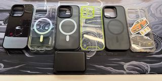 Conjunto de fundas para iPhone 16 Pro. - Funda transparente con borde de color neón. - Funda transparente con diseño de coches. - Funda negra con MagSafe. - Funda transparente con MagSafe. - Funda negra con MagSafe. - Funda Porsche con MagSafe. - Cartera negra con soporte para tarjetas. Precio por todo.