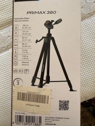 Trípode Cullmann Primax 380, ideal para fotografía. - Altura máxima: 159 cm (62.60 pulgadas). - Altura mínima: 62 cm (24.41 pulgadas). - Longitud plegado: 66 cm (25.98 pulgadas). - Peso: 1.535 g (3.38 lbs). - Capacidad de carga: 3,5 kg (7.72 lbs). - Material: Aluminio.