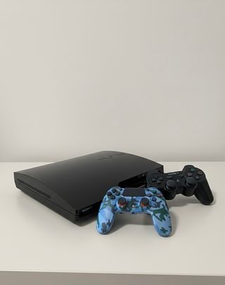 Consola PlayStation 3 Slim en color negro. - Modelo Slim. - Es una versión mas compacta y ligera que el modelo original, lanzada por Sony en 2009. - Un mando oficial Sony DualShock 3 de color negro - Un mando DualShok 4 con diseño de camuflaje azul y verde.