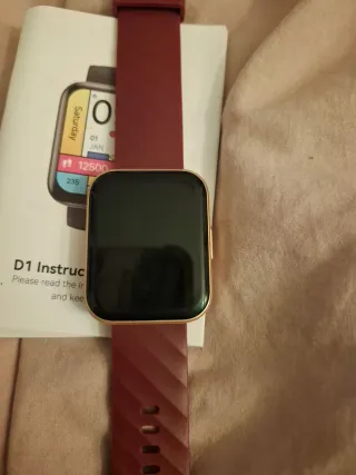 Reloj inteligente RUIMEN con correa de color rojo y detalles dorados. Incluye manual de instrucciones. - Correa de color rojo. - Detalles en tono dorado. - Cargador