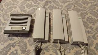 Sistema de telefonillo para puerta con tres unidades interiores. - Unidad exterior con rejilla y espacio para placa. - Tres unidades interiores de color blanco. - Cableado en espiral para conexión.