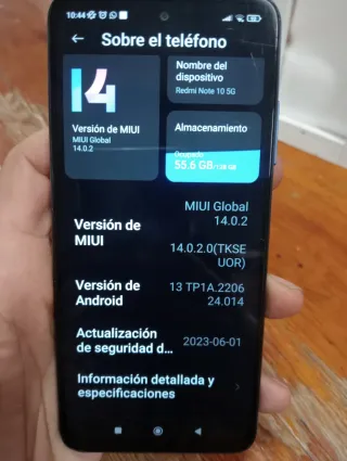 Teléfono móvil Xiaomi Redmi Note 10 5G en color negro y con 128 GB de almacenamiento. - Versión de MIUI Global 14.0.2. - Versión de Android 13. - Actualización de seguridad del 01-06-2023.