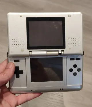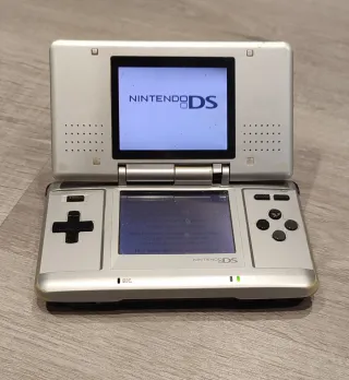 Consola portátil Nintendo DS Fat en color gris plata. -Ambas pantallas funcionan perfectamente. -bisagra derecha bastante rota,pero aun conserva su posición al reclinar la pantalla. - Trae su cargador original. - los juegos corren perfectamente. Tal como la ves en la foto.