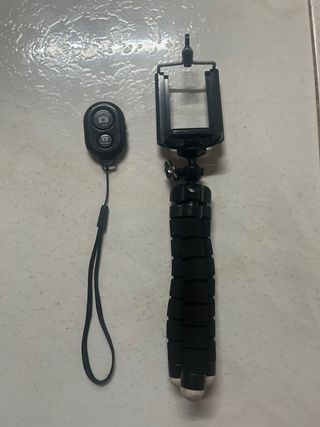 Este trípode flexible es perfecto para colocar tu móvil o cámara en cualquier lugar. Incluye un mando a distancia para disparar fotos o vídeos sin tocar el dispositivo. - Trípode con patas articuladas. - Soporte universal para móvil/cámara. - Mando a distancia Bluetooth.