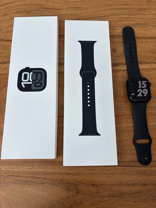 Vendo Apple Watch Series 10 de 42 mm, color Jet Black, versión GPS, comprado en agosto de 2025, por lo que todavía está en garantía oficial de Apple. Salud de batería: 97% Muy poco uso, funcionamiento perfecto. Incluye todo lo original: • Caja del reloj • Caja de la correa • Cable de carga USB-C • Documentación original Estado: El reloj está en muy buen estado general. Tiene una pequeña marca en el cristal, visible solo si se mira con atención; con funda o protector no se aprecia (ver fotos). El resto, impecable. Correa original Sport Band negra (S/M) incluida.