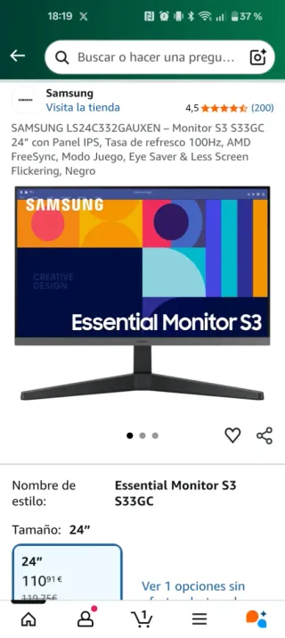 Monitor Samsung S33GC de 24 pulgadas en acabado negro. SAMSUNG LS24C332GAUXEN – Monitor S3 S33GC 24” con Panel IPS, Tasa de refresco 100Hz, AMD FreeSync, Modo Juego, Eye Saver & Less Screen Flickering, Negro - Diseño elegante y moderno. - Pantalla nítida para una visualización clara. - Panel IPS - Ningún rayón - Se entrega con cable de alimentación - Perfecto estado