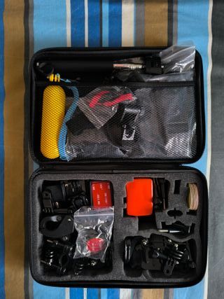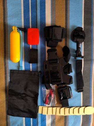 Estuche con diversos accesorios para cámaras deportivas. - Incluye soporte para manillar. - Adaptadores y tornillos de montaje. - Correa para cabeza y pecho. - Flotador amarillo. - Monopod extensible. NO se aceptan devoluciones.