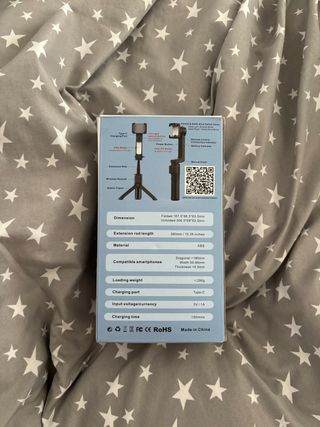 Estabilizador de móvil con diseño versátil que incluye trípode y control remoto inalámbrico. - Puerto de carga Tipo-C. - Varilla de extensión de 300mm / 15.35 pulgadas. - Material: ABS. - Compatible con smartphones con diagonal <180mm, ancho 50-90mm y grosor <9.5mm. - Peso de carga: <290g. - Voltaje de entrada/corriente: 5V/1A. - Tiempo de carga: 150 minutos.