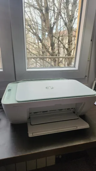 Impresora multifunción HP Deskjet 2700e en color blanco y verde. - Conexión Wi-Fi. - Escáner integrado. - Bandeja de salida extensible. En perfectas condiciones, se vende por falta de uso.