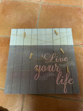 Panel decorativo con diseño de tablones de madera y la frase Live your life en letras rosas. Incluye cuerdas y pinzas de madera para colgar fotos. - Diseño rústico. - Incluye 7 pinzas de madera. - Cuerda de yute.